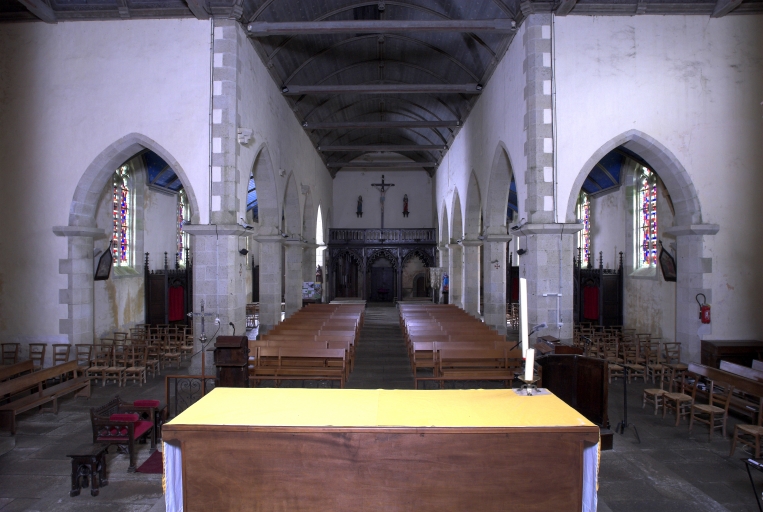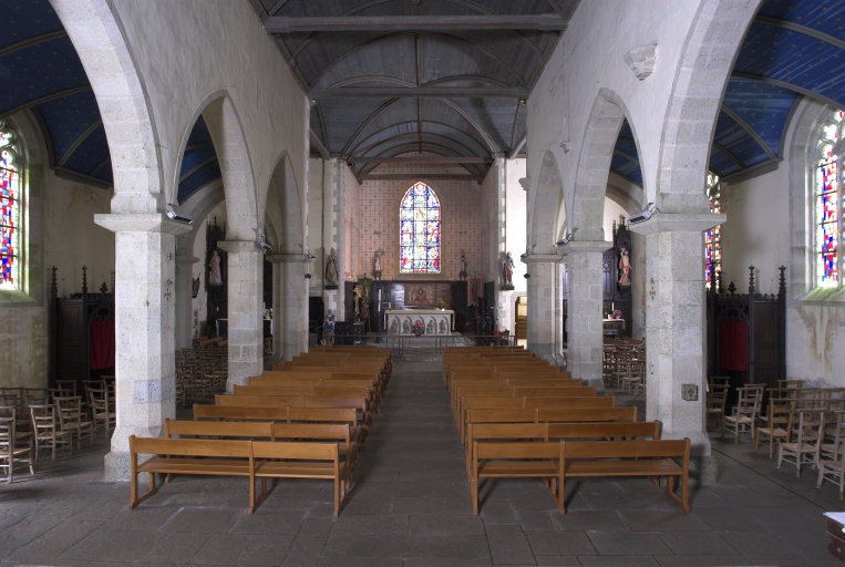 Gros-oeuvre en moellon enduit, à l'exception de la partie ouest (tour, clocher), du soubassement et des frontons des baies éclairant les bas-côtés, en pierre de taille de granite. Soubassement en granite provenant de Huelgoat. Plan régulier en croix latine. Nef obscure à cinq travées flanquée de bas côtés éclairés par des fenêtres passantes en lucarne. Arcades en arc brisé reposant sur les tailloirs de piles carrées ou rectangulaires chanfreinées. Chevet plat. Massif occidental dans oeuvre cantonné de contreforts. Tour massé de plan carrée enfermant la chambre des cloches surmontée d'une plate-forme entourée de balustres et d'amortissements d'angle. Flèche hexagonale peu ajourée et de plan réduit liée aux amortissements par des arcades. Tourelle d´escalier nord-ouest circulaire coiffée d'un dôme et donnant à l´origine sur l´extérieur. Porche sud et sacristie sud hors-oeuvre. Lambris de couvrement peint : étoiles sur fond bleu. Sol couvert de grandes dalles de granite, à l´exception du choeur, couvert de carreaux en terre cuite vernissée rouge et blanc (décor : hermines, croix). Murs intérieurs couverts d´un enduit au ciment avec infiltrations ou remontées d´humidité. Choeur couvert d´un enduit en ciment partiellement peint en trompe l´oeil drapés (croix, fleurs de lys).