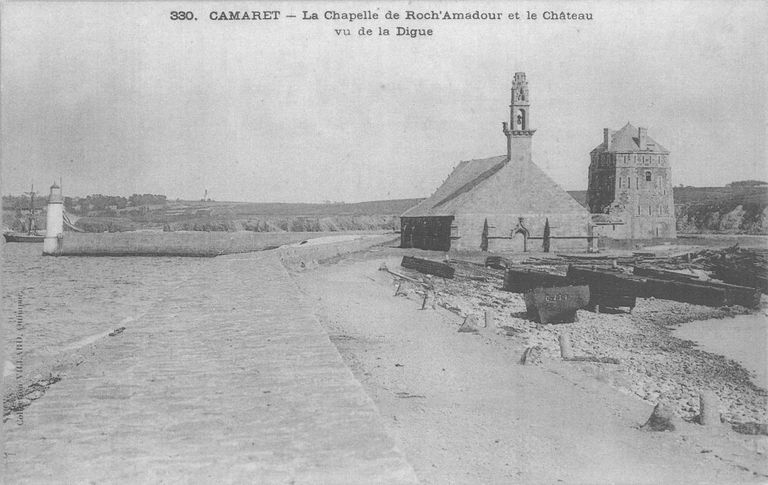 Les traces d´une première chapelle sont attestées sur ce lieu dès 1183, puis en 1373. Les inscriptions sur la pierre noire située dans le mur extérieur semble indiquer qu´une nouvelle chapelle est édifiée en 1527. Mais la chapelle que nous voyons actuellement fut construite entre 1610 et 1683 sur la roche Roch' a ma dour qui arme le sillon de galets. Il est possible que la flèche de la chapelle ait été détruite durant la bataille de 1694, même si aucun document ne l´atteste avec certitude. La toiture fut détruite par un incendie le 24 février 1910. Le nom de cette chapelle viendrait du pèlerinage vers St Jacques de Compostelle dont Rocamadour en Quercy est l´une des étapes. Un abbé érigea ici une chapelle pour servir d´étape aux pèlerins nordiques qui allaient prier la vierge noire de Rocamadour et qui débarquaient à Camaret. La vocation maritime de cette chapelle est attesté tant par son site d´implantation (jusqu´au 17e siècle, la chapelle était isolée de la côte à chaque marée haute) que par son rôle d'étape pour des pèlerins venant par mer et par les traditions qui s'y rattachent. En effet, par temps de brume, la cloche de la chapelle guidait le retour des bateaux et son pardon en septembre était suivi d´une bénédiction de la mer. On trouve aussi à l´intérieur 8 ex-votos marins : 3 maquettes suspendues (2 goélettes morutières étrangères à Camaret et le langoustier Belle-Étoile), 4 bouées avec leurs rames (St-Christophe et N.D. de Bon Secours de Camaret, N.D. de Lourdes d´Ouessant, Rouanez-ar-Rosera d´Audierne) et une maquette sous vitrine devant un paysage peint. Une petite copie d´une oeuvre du peintre Charles Cottet représentant l´incendie de la chapelle se trouve dans l´édifice, l´original étant conservé à la mairie.
