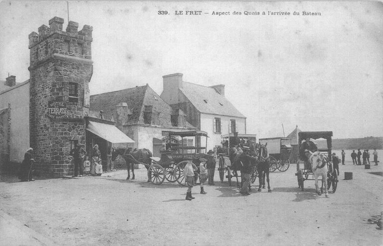 Au début du 18e siècle, le port du Fret ne compte que 16 magasins de pêcheurs. Un siècle plus tard, 21 bâtiments sont recensés : 19 magasins et 2 maisons d´habitation, l´une d´elles faisant également fonction de magasin. Le développement des multiples activités portuaires nécessite de doter le front portuaire d´infrastructures pour améliorer le transit terre/mer. Les échanges concernent à la fois le trafic de passagers (vers Morgat notamment), de marchandises et celui de produits de la pêche entre la presqu´île et Brest. Les travaux commencent vers 1844 avec la construction d´une cale, que complète celle du quai en 1862. L´année suivante, le débarcadère de Roche Noire est construit. Au début du 20e siècle, l´augmentation du nombre de voyageurs transitant par le Fret contribue à la transformation des magasins de pêcheurs, en habitations et commerces, en cafés notamment. On en dénombre près d´une quinzaine dans les années 1930 et 1940. On peut notamment citer le café « Commerce de vins, on y loge et on y mange », à l´angle du port (transformé en maison), le café « à l´Arrivée de Brest » (à l´endroit du bar-café actuel) ou le café « à l´Arrivée des Promeneurs « (actuelle crêperie). Parallèlement, les hôtels se multiplient avec l´essor du tourisme : Hôtel de la Terrasse, Hôtel Morgat. Aujourd´hui, seuls quelques commerces subsistent : l´Hostellerie de la Mer au sud et l´ensemble constitué par la crêperie et le bar-tabac au nord. Pour assurer la protection des bateaux de pêche et la sécurité des voyageurs, les infrastructures portuaires sont allongées ou exhaussées à maintes reprises entre la fin du 19e siècle et au cours du 20e siècle. Elles sont complété par deux terre-pleins : le premier situé à l´ouest du front portuaire où est construite la gare (1920-23) et le second à proximité du débarcadère de Roche Noire (1990), faisant office de parking pour voitures et bateaux.