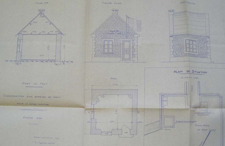 Au début du 20e siècle, le port du Fret était déjà pourvu d´un bureau du garde maritime situé à droite de la cale. Ce corps de garde (très vétuste et construit en bois) était considéré comme gênant et encombrant sur le terre-plein déjà très exigu du port. En 1947 a donc été décidé d´établir un nouveau bâtiment en remplacement. A L´origine, une petite guérite adossée au nouveau bureau et destinée à abriter les douaniers de passage était prévue. Mais la réorganisation du service des brigades des douanes rendit inopportun le remplacement de la baraque des douaniers située sur le quai (en raison du faible effectif des marchandises débarquées au Fret). Les travaux, confiés à M. Velly, artisan maçon du Fret, furent entrepris en 1947. Le local est maintenant utilisé comme un local pour entreposer du matériel.