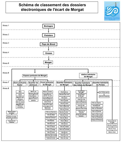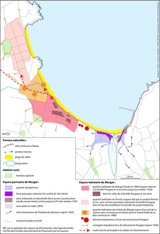 - PING Le bâti de l´écart de Morgat a été profondément remanié et il est souvent difficile de retrouver les traces des constructions anciennes, les forts et batteries ont disparu ; parfois remplacés par des villas. Cependant, la prise en compte de l´ensemble des thèmes patrimoniaux liés aux activités développées en relation avec la présence de la mer permet de repérer assez aisément les strates historiques de la constitution du port de Morgat : anciens magasins de pêche du 18e siècle, petit front portuaire du 19e, quartiers de pêcheurs des années 1900... tandis que le front de mer balnéaire hérité des années 1880-1920 est encore en place sans avoir été lourdement transformé ; ce qui est rare pour une station balnéaire française.