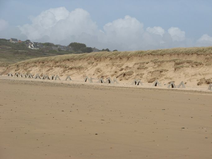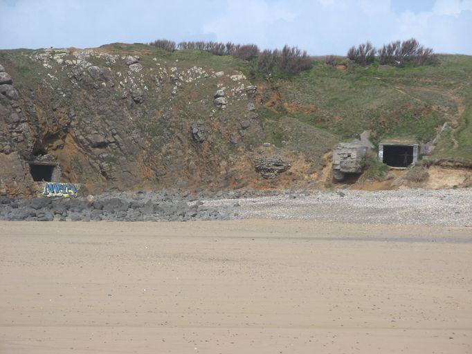 Une trentaine de tétraèdres en béton sont posés en haut de plage. Les casemates sont également en béton et sont ouverts sur l'océan.