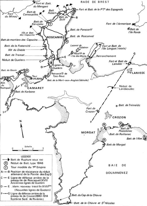 La presqu´île de Crozon, située à la pointe de la Bretagne, est limitée au nord par la rade de Brest et au sud par la baie de Douarnenez. Elle s´ouvre sur la mer d´Iroise, passage entre la Manche et au-delà entre les mers du Nord et Baltique, riveraines des îles britanniques et de l´Europe septentrionale, et l´océan Atlantique, qui mène à l´Europe du Sud et au Nouveau Monde. Cette position stratégique de la presqu´île de Crozon explique l´implantation militaire ancienne et importante. Elle se trouve par ailleurs à proximité du grand port militaire de Brest créé au 17e siècle. Dès le Moyen Âge, l´emplacement stratégique de la presqu´île de Crozon est exploité. En témoigne notamment la présence d´une motte féodale eu lieu-dit de l´Aber. A partir de la fin du 16e siècle, des troupes de garde-côtes, formées d'hommes levés dans les paroisses côtières et encadrées par des officiers garde-côtes, sont chargées de la surveillance des côtes. A cette époque, les débarquements espagnols, à l´instar de celui de la pointe des Espagnols en 1594, puis anglo-hollandais, comme celui manqué du 18 juin 1694 (bataille de Camaret), sont craints. Au 18e siècle, Crozon est le siège d´une capitainerie qui s´étend alors de la rive gauche de l´Elorn (Dirinon) au sud de la baie de Douarnenez (Kerlaz). Cette circonscription comprenait un bataillon de garde-côtes pour défendre le littoral. Ce système perdurera jusqu´à la Révolution Française, un corps de volontaires remplaçant ensuite les populations littorales. A la fin du 17e siècle, l´ingénieur Sébastien Le Prestre de Vauban, au service du roi Louis XIV, entreprend la construction d´un système défensif sur les côtes bretonnes. La Tour Vauban, à Camaret-sur-Mer, est notamment construite, entre 1693 et 1696 afin d'interdire à l'ennemi d'entrer en rade de Brest. D´autres ouvrages ont été bâtis sur la côte à cette époque, mais tous n´ont pas été conservés (ruines de la batterie de côte et du corps de garde de la Mort aux Anglais, corps de garde de Lostmarc´h, premier corps de garde de l´Aber, aujourd´hui détruit, batterie de la pointe du Toulinguet, aujourd´hui pratiquement disparue...). Au 18e siècle, de nouveaux ouvrages sont construits en remplacement d´installations détruites ou devenues obsolètes (corps de garde de Postolonnec ou de l´Aber, batteries des pointes du Kador, du Petit et du Grand Gouin, fortifications du Toulinguet) ou sur de nouveaux sites (corps de garde de Penhoat, de Rulianec, batteries de Kerbonn, poudrière de l´Île aux Morts...). Certains sont construits selon un plan-type que l´on retrouve sur d´autres sites de la presqu´île ou plus largement des côtes françaises (corps de garde crénelé type n° 2 de la circulaire de 1846 du Petit Gouin et de la pointe du Kador ou de type n° 3 pour le corps de garde de Rulianec). Durant la Seconde guerre mondiale, des ouvrages diversifiés seront également construits par l'occupant allemand (batterie du cap de la Chèvre, casemate de Rulianec, obstacles de la plage de Sainte-Anne-la-Palue...). Seuls les bâtiments situés à proximité immédiate du littoral et dont des vestiges subsistent ont été traités. Ainsi, les casemates (Trémaïdic) ou les batteries (Landouadec) situées à l´intérieur des terres n´ont pas été étudiées.