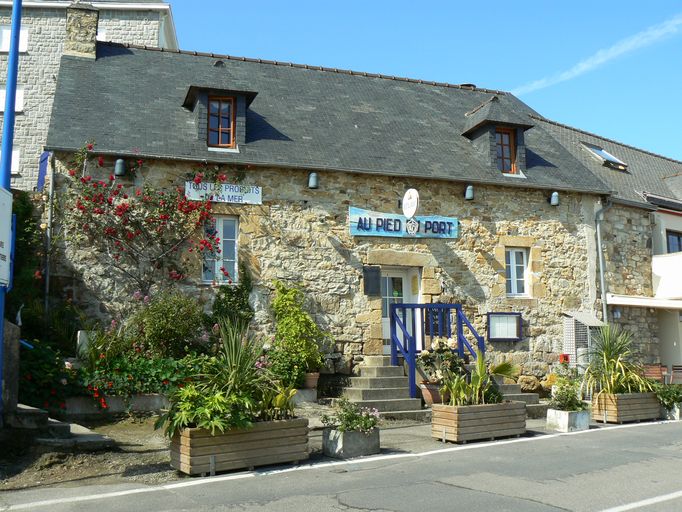Le restaurant Au pied du port se trouve aujourd´hui au bout d´un alignement de maisons. De plan rectangle, il est légèrement surélevé par rapport au quai actuel, ce qui a nécessité la construction d´un perron à degrés rectangulaires - cet aménagement n´était pas indispensable avec l´ancienne rampe, sur laquelle donnait directement la porte. Avec son toit en ardoises et ses murs en pierres apparentes, l´architecture symétrique de la maison est très simple : une porte, deux fenêtres et deux lucarnes à croupe (ou dites aussi capucines). Depuis la rampe, le visiteur peut accéder à l´étage, grâce à une porte réalisée dans le pignon sud. L´habitation possède une souche de cheminée. Modeste, ce bâtiment est un exemple des évolutions de Morgat.