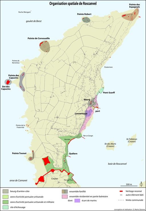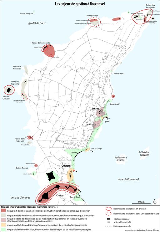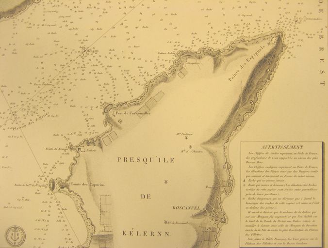La commune de Roscanvel, située dans la partie septentrionale de la presqu´île de Crozon, est constituée par une presqu´île tabulaire qui s´avance en éperon en direction de Brest (presqu´île de Quélern ou de Roscanvel). Sa partie nord, bordée d´une côte à falaise qui se termine par la pointe des Espagnols, ne laisse que le détroit du « Goulet » comme exutoire de la rade de Brest, tandis que sa partie sud, amincie en étroit isthme de 1 km de large, s´articule sur la commune de Crozon. Cette « presqu´île de la presqu´île » bénéficie donc d´une situation géographique exceptionnelle puisqu´elle s´ouvre à l´est sur la baie de Roscanvel et la rade de Brest, et à l´ouest sur l´anse de Camaret et la mer d´Iroise. Elle se présente comme un plateau d´altitude moyenne d´une soixantaine de mètres qui tombe généralement de façon assez abrupte dans la mer, et plus particulièrement dans sa partie ouest et nord-ouest où la côte élevée offre une succession de saillies qui ont constitué au cours de l´histoire les supports ou les abris d´une série de défenses et fortifications destinées à protéger la place de Brest des invasions ennemies. Ce rôle défensif est devenu majeur à partir du moment où le site de Brest a été choisi par le roi Louis XIV et son ministre Colbert pour l´édification d´un grand port au ponant du royaume de France.