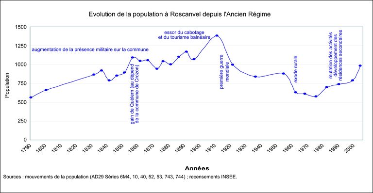En ce début de 21e siècle, du fait de l´effacement de la Marine militaire et de l´extinction du trafic par mer de passagers et de marchandises, Roscanvel, sans activités propres, est devenue une agréable commune dortoir pour les personnes travaillant dans les communes voisines puisqu´une grande partie des actifs part travailler quotidiennement à Camaret, Crozon, Lanvéoc (base militaire) ou Brest. Plus aucun agriculteur ne travaille sur la commune. Cette commune de 983 habitants en 2004 est également habitée par un nombre important de personnes âgées qui s´y installent au moment de la retraite. Quatre habitants sur dix avaient plus de 65 ans en 1999, mais seulement un sur trois en 2004 car un rajeunissement de la population se dessine depuis peu, du fait de l´installation de jeunes couples travaillant sur d´autres communes de la presqu´île. Leur choix résidentiel s´explique par une pression immobilière et touristique moindre que dans les communes voisines ; la commune, relativement isolée, ne possédant qu´un seul commerce (épicerie-café-tabac) et aucun équipement touristique (ni hôtel, ni restaurant). Hormis le centre d´entraînement de l´Armée de Terre, elle n´accueille que quelques artisans, un médecin, un centre de plongée et un camping municipal. Notons aussi le fort pourcentage de résidences secondaires (un logement sur deux en 2004) par rapport aux autres communes de la presqu´île de Crozon. Au total, malgré l´absence d´emplois sur la commune, la population rocanveliste a augmenté de plus de 40 % durant ces vingt dernières années en liaison avec une recomposition de sa population et de l´usage de son territoire.