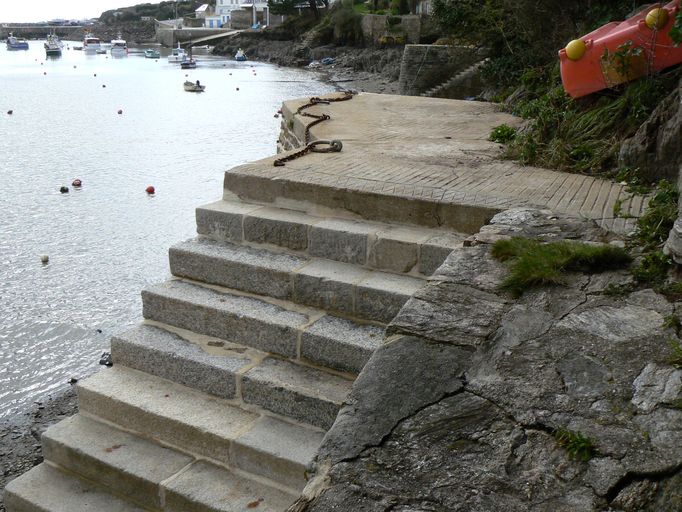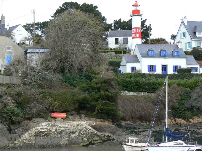 Dans la première moitié du 19e siècle, les ingénieurs des Ponts et Chaussées constatent que « le nombre de barques employées à la pêche ayant considérablement augmenté ». Pour assurer la sécurité de ces marins plus nombreux, le principe de construction de deux fanaux dans le port est approuvé par décision ministérielle le 28 mars 1846. Le projet n´est mis à exécution qu´à partir de 1859 : un feu vert est construit en aval, sur la rive gauche, et un feu rouge en amont, sur la rive droite. A la fin des années 1860, une maison de gardien (bâtiment principal avec rez-de-chaussée et mansarde à l´étage, complété de deux appentis, dont l´un sert au stockage des huiles) est construite au pied du feu amont. Afin de pouvoir passer d´un feu à l´autre sans faire un grand détour par le fond de la ria et faciliter l´acheminement des huiles et du matériel pour le fonctionnement du feu, le gardien de phare traverse la rivière de Doëlan. Pour accéder à la rive gauche, il utilise le quai de Kernabat, puis emprunte un étroit chemin jusqu´au feu. Pour accéder à la rive droite, un appontement est construit, composé de deux escaliers reliés à un petit terre-plein sommital, accessible depuis le jardinet de la maison du gardien. A la fin des années 1890, l´appontement de la rive droite apparaît sur un plan général du port réalisé par le service des Ponts et Chaussées sous la mention « cale du phare ».