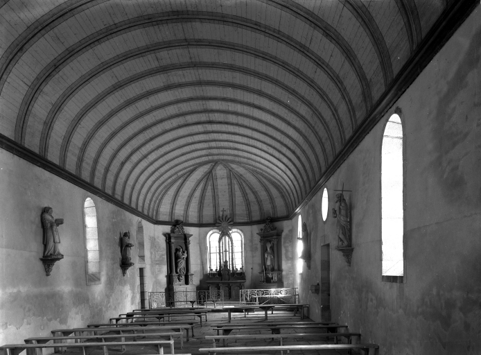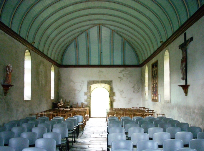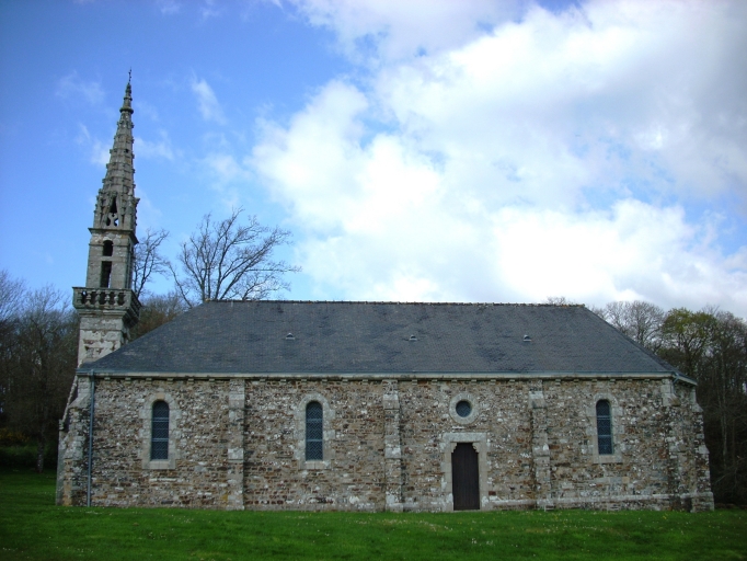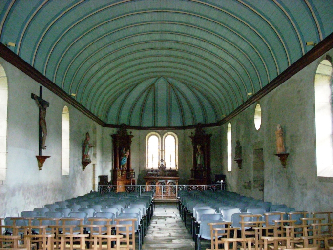 Edifice de plan allongé à vaisseau unique éclairé par six fenêtres et un oculus. Sacristie au nord. Clocher hors-oeuvre en pierre de taille de granite et de kersantite. Baie surmontée d´une chambre de cloches ajourée à galerie amortie d´un lanternon à crossettes. Nef couverte d'un toit à croupe à l'ouest, sans lien avec la tour-clocher. Gros oeuvre en moellon équarri de granite et de schiste, à l'exception des chaînages d´angle et des encadrement de baies, en pierre de taille de granite. Lambris de couvrement peint en bleu pâle et nervures en rouge. Sol couvert de dalles d´ardoise. Murs enduits de ciment à l´intérieur.