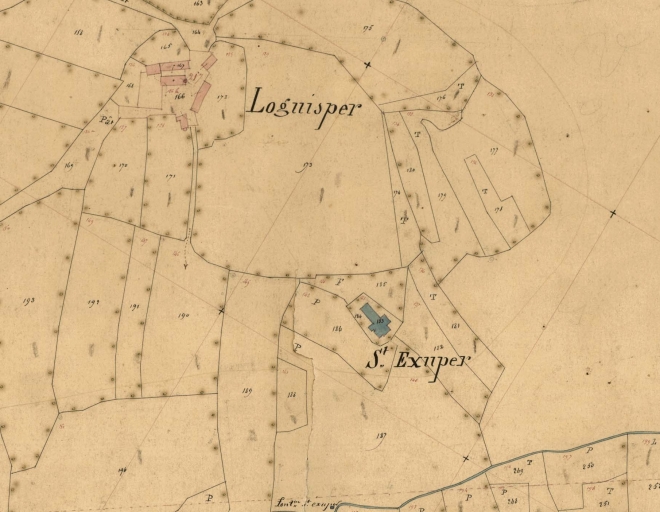 D´une chapelle dédiée à saint Exupère de Bayeux (Ispar en breton) construite par les Kersauson, seigneurs de Rozarnou, dans la première moitié du 16e siècle, ne subsistent pas de vestiges, sauf une verrière (vers 1535) conservée au musée départemental breton à Quimper. La tour ouest porte la date de 1669 ainsi que l´inscription E. SALAUN MA FAICT (nom du maître-maçon ?). A cette période correspond la totalité de l´élévation ouest, à l´exception des crossettes sculptées et de la flèche, sans doute des remplois de l´édifice du 16e siècle qui a du être remanié ou rebâti entre 1648 et 1669 ; de plan en croix latine, il figure sur le cadastre de 1848. A la fin du 19e siècle, on relevait la date de 1648 sur les sablières de la nef. En mauvais état, l´édifice, sauf l´élévation ouest, a été reconstruit en 1893, un financement partiel étant assuré par la vente de la verrière ancienne à la Société archéologique du Finistère. La sacristie date de 1906. Des photographies de 1972 montrent l'édifice entourés de grands arbres. Placée à l'ouest de l'enclos, une statue de Christ souffrant, sans doute le vestige d'un calvaire (17e siècle ?), provient du jardin du presbytère de Dinéaut où elle se trouvait en 1978. L'inventaire complet des objets mobiliers (fiches descriptives, photographies) conservés dans ces édifices, non reconduit dans le cadre de l'enquête de 2009, avait été réalisé en 1972 ; il est disponible au centre de documentation du patrimoine (Région Bretagne).