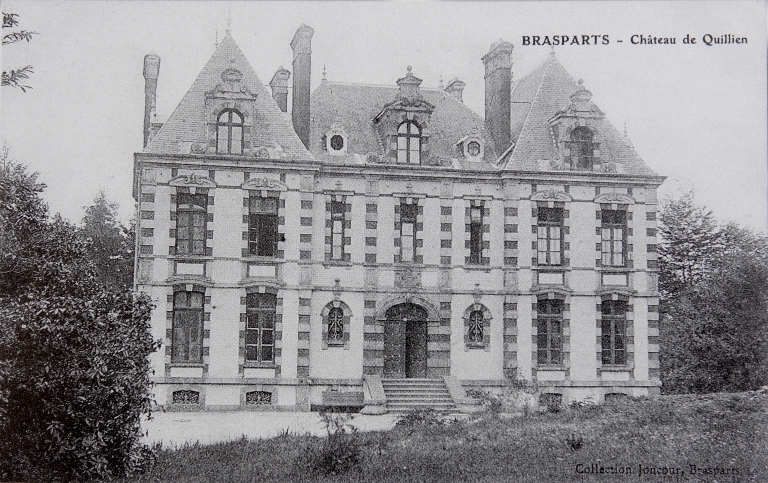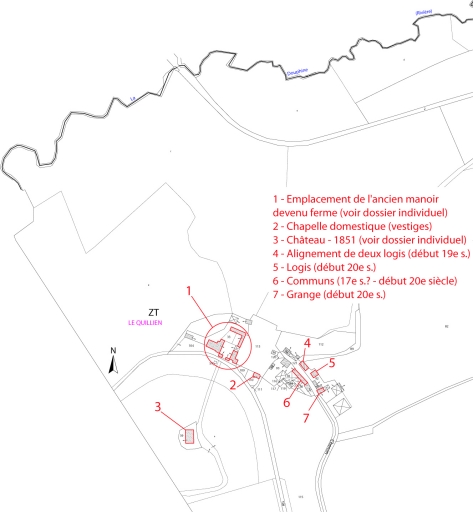 Le lieu noble de Quillien est attesté en 1426. Les vestiges d´un gisant du 15e siècle conservés dans le parc passent pour être ceux d´un seigneur du lieu, peut-être Jean Cabournay, seigneur de Quillien. Dès le 16e siècle, le domaine inclue des vastes bois, un moulin à eau, un colombier, une chapelle et un verger clos de murs. En 1751, il englobe une vingtaine de métairies sur le seul territoire de Pleyben. L´ancien logis du manoir, peut-être du 16e siècle, semble figurer sur le cadastre de 1813. Le domaine de Quillien passe, par héritage, aux Kerret qui le possèdent au 19e siècle, époque marqué par un renouveau architectural du lieu (bâtiments, allées, parc, pièce d´eau). L´ancien manoir est déclassé en métairie et une nouvelle demeure est construite au sud-ouest du site ancien. En 1851, à la demande de René-Maurice de Kerret, Joseph Bigot l´architecte départemental, dresse les plans du château. A quelques détails près, l´édifice, d´inspiration néoclassique selon la volonté du commanditaire, est réalisé suivant le projet initial, aussi bien à l´extérieur qu´à l´intérieur. L´ancien domaine est aujourd´hui partagé en plusieurs propriétés foncières. Du château dépendent l´ancienne chapelle du 16e siècle (vestiges), une fontaine datée 1677 et un ancien abreuvoir à chevaux portant un décor sculpté figurant un lion.