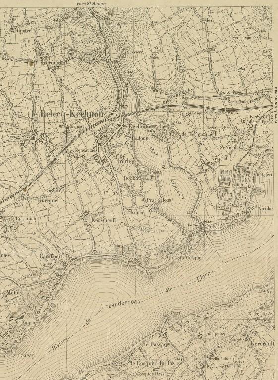 Réalisé en 1828, le cadastre parcellaire de Guipavas figure l’anse de Kerhuon et plusieurs lieux-dits sur la pointe dite de Saint-Nicolas : du nord au sud, Lesquibou, Kerhuon (château et dépendances), Kersalous, Saint-Nicolas et Kergoat. La chapelle Saint-Nicolas et sa croix sont implantées le long de la route qui descend de Chapelle Croix à la Maison blanche. L’anse de Kerhuon est fermée par une digue dotée d'une écluse avec logement. Au nord de l’anse se trouve les deux moulins de Kerhuon. L’anse de Kerhuon (section D2 : n° 1136), le lieu-dit Kerhuon (section D2 : n° 726-728), certaines parcelles de la pointe de Saint-Nicolas - situées le long de l’anse et identifiées comme le "chantier de Kerhuon" appartiennent à l’Etat à cette date (section D2 : n° 1121-1124).