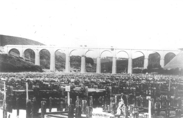 - Vue de la construction du viaduc ferroviaire de Kerhuon, 1862 (collection de la Bibliothèque nationale de France). Au premier plan, le parc à bois de la Marine