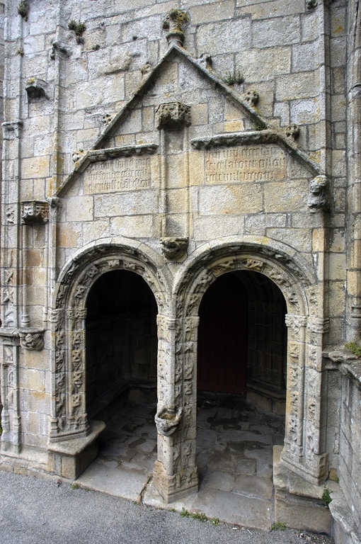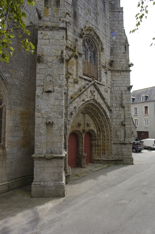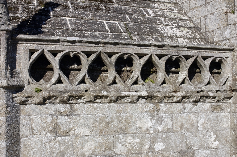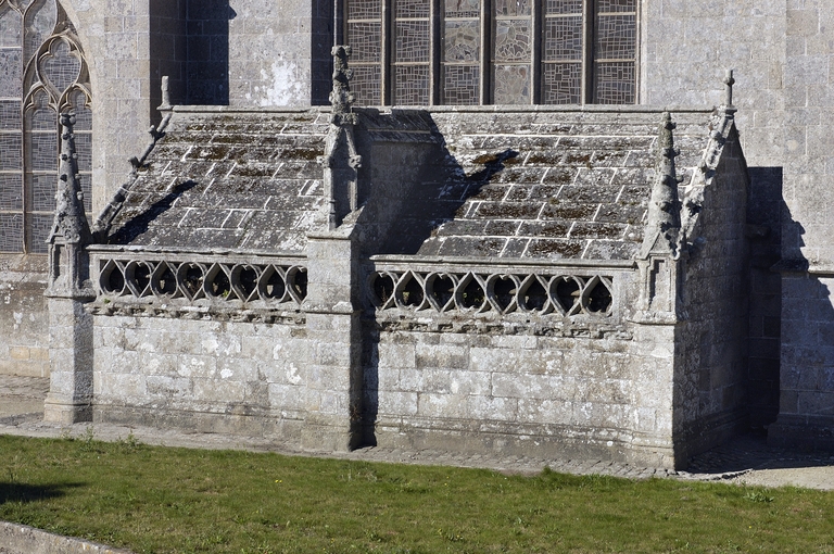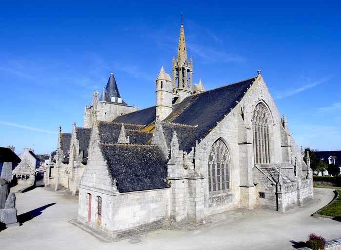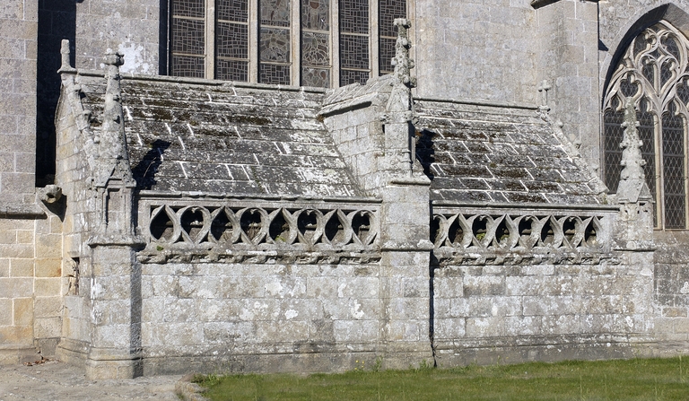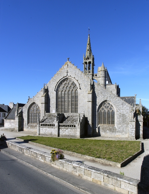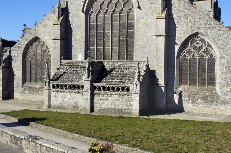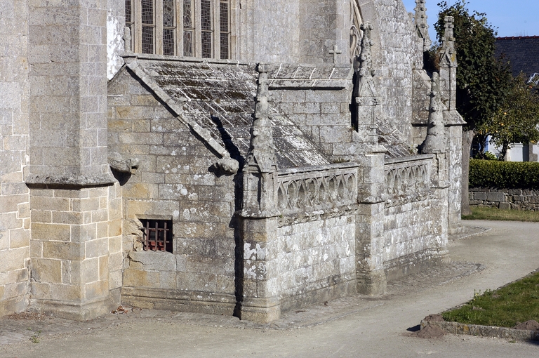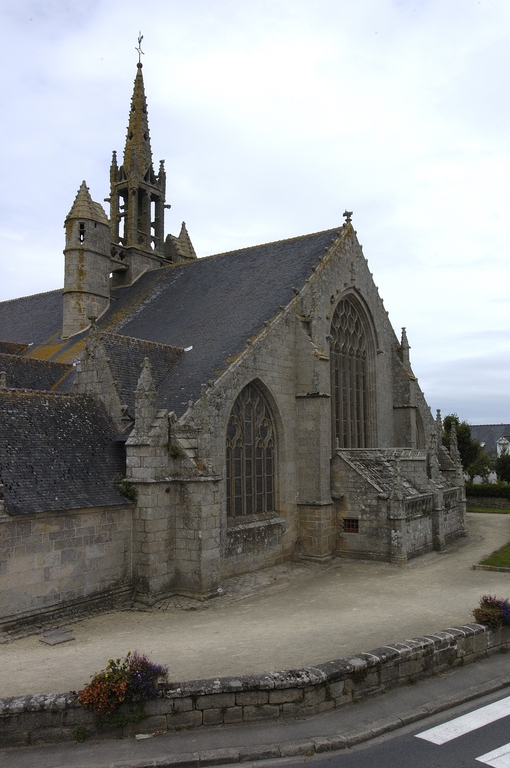L´édifice est bâti dans un granite gris jaune à muscovite, soigneusement appareillé. Le chevet reprend l´ordonnance tripartite des grandes chapelles du dernier tiers du 15e siècle. Seule innovation, la sacristie, ou chambre du trésor, qui flanque généralement le chœur, est ici adossée au chevet plat. Elle forme une salle rectangulaire médiocrement éclairée. À un toit en appentis qui aurait occulté le bas de la maîtresse-vitre, on a préféré une couverture à deux versants inégaux en dalles de granit portées à l´intérieur par sept arcs-doubleaux en berceau rampant, retombant sur des dosserets. Une balustrade ajourée de cœurs tête-bêche couronne son mur oriental. Les élévations latérales alternent pans de murs bas aveugles et lucarnes passantes, et non la file de pignons perpendiculaires à l´axe de l´édifice dont la vogue culmine autour de 1500 en haute Bretagne. Celles du chœur sont de proportions plus modestes et ne présentent pas la riche mouluration qui encadre les pignons de lucarnes de la nef. Elles portent un décor sculpté où prédomine la thématique maritime. Deux portes en anse de panier surmontées d´une accolade donnent accès respectivement au chœur et à la nef. Les contreforts ne sont pas dans l´alignement des supports intérieurs. Du côté sud, leur couronnement est alternativement taluté et amorti par un pinacle, ou en bâtière. Sans être franchement négligée comme c´est la règle en Bretagne, l´élévation nord est moins richement traitée. Du reste, le bas-côté nord du chœur est dépourvu de lucarnes et n´est éclairé que par deux petites baies au réseau flamboyant : peut-être le chantier a-t-il démarré à cet endroit. Au-dessus de l´arc triomphal, s´élève un clocher central fort élégant, composé d'un clocheton à chambre ouverte coiffé d´une flèche, et encadré par deux tourelles symétriques auxquelles le relie une coursière à garde-corps ajouré de quadrilobes, portée par deux arcs en quart-de-cercle ; dans la tourelle nord débouche un escalier en vis ménagé dans la pile correspondante de l´église. Le parti est inspiré de la chapelle voisine de Tronoën et connaîtra, transposé sur le mur-pignon occidental, un succès durable en Cornouaille.