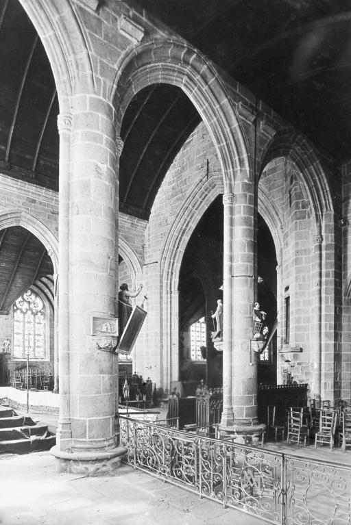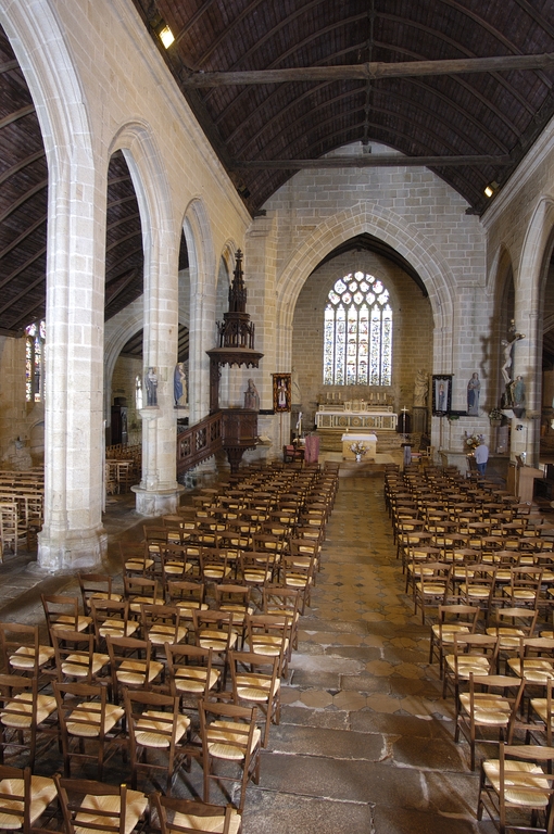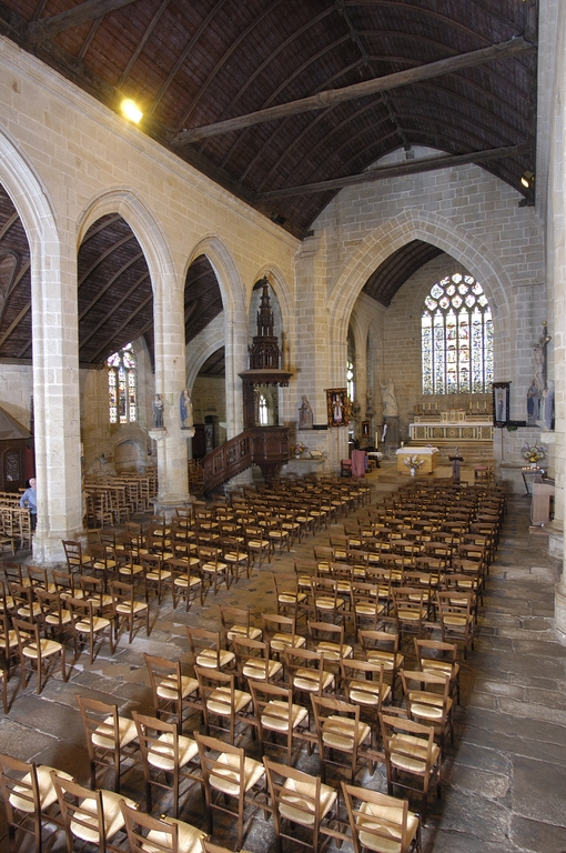 Inscrit dans un rectangle irrégulier de 37,40 m de long sur 24 m de large environ, l’édifice à trois vaisseaux se compose d'une nef de cinq travées, séparée par un arc-diaphragme d’un chœur de trois travées, l’un et l’autre flanqués de larges collatéraux. Il est précédé à l'ouest d'une puissante tour clocher hors œuvre flanquée au sud d'un petit porche et au nord d’une chapelle seigneuriale où l’on transféra en 1782 les fonts baptismaux, précédemment installés au bas du collatéral sud, où l’on voit encore une cheminée souvent associée en Cornouaille à cet usage. Bien que R. Couffon la date de 1556, elle semble bien contemporaine du reste de la construction. A l'est, l’ancienne sacristie est adossée au chevet plat. Cette structure remarquablement homogène n’a subi qu’une adjonction : la sacristie greffée entre deux contreforts du bas-côté sud du chœur, en 1789.Les supports sont de fortes colonnes flanquées dans l’axe longitudinal de minces colonnettes recevant le premier rouleau des grands arcs par l’intermédiaire de chapiteaux feuillagés à corbeille renflée. Dans les deux travées ouest de l’église, les colonnes font place à des piles octogonales. Les chapiteaux, réduits dans la dernière travée est de la nef à une simple moulure, disparaissent ensuite, toutes les nervures pénétrant directement dans les supports. La plupart de ceux-ci sont dotés, sur leurs faces nord, ouest et sud, de consoles sculptées destinées à recevoir une abondante statuaire, pour partie conservée. Des entailles dans les piliers marquent l’emplacement d’une ancienne clôture de chœur. L’arc triomphal retombe au nord sur un puissant massif de maçonnerie de plan losangé, flanqué de faisceaux de colonnettes et abritant un escalier en vis desservant le jubé (disparu) et le clocher médian. Dans son pan nord-est, deux portes rectangulaires superposées, surmontées chacune d'une fine accolade, témoignent encore de cette disposition originelle. Les grandes arcades en arc brisé montent très haut : dans le chœur, seules deux assises séparent leur clé de la corniche moulurée qui reçoit les sablières. Celles-ci portent un lambris en berceau brisé, refait à plusieurs reprises, légèrement plus bas dans le chœur que dans la nef. La charpente de cette dernière possède quatre entraits engoulés, qui ont disparu ou n’ont jamais existé dans le chœur. Si le vaisseau central est aveugle, l’édifice est néanmoins largement éclairé par les baies des collatéraux, les trois grandes verrières du chevet et, en second jour, par la baie ouest de la tour. Ce parti général, d’une grande monumentalité, est identique à celui des grandes chapelles cornouaillaises de la seconde moitié du XVe siècle, construites sous l’influence directe de la nef de la cathédrale de Quimper, comme Notre-Dame de Kerdévot. Il plaiderait donc en faveur d'un chantier commencé par le chœur dans les deux dernières décennies du siècle et mené rapidement d’est en ouest. Au-dessus des grandes arcades, on remarque dans les bas-côtés une succession d’élégantes consoles qui devaient recevoir, peut-être par l’intermédiaire d'une sablière, le lambris de couvrement d'origine. Ces collatéraux accueillaient une succession de chapelles privatives : si les autels en ont disparu, on voit encore, sous chaque vitrail, un enfeu, accompagné d’une crédence et d’un bénitier. On sait par exemple que la dernière chapelle du côté sud abritait jusqu’en 1789 l’enfeu des seigneurs de Rosulien en Plomelin.