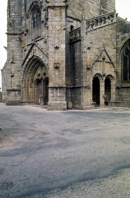 Monumentales, presque hors d´échelle, la tour clocher de Saint-Nonna et sa voisine de Saint-Guénolé (1488) sont l´œuvre d´un même atelier. La structure en est identique : un portail ouest composé de deux portes géminées en plein-cintre réunies sous une quadruple voussure en tiers-point dont l´archivolte forme une accolade à choux frisés et fleuron ; le gâble qui coupe les pinacles latéraux est une réplique du portail du bras nord du transept de Quimper (1478). Au-dessus, une fenêtre à réseau flamboyant s´ouvre sous une accolade ornée de choux frisés retombant sur des culots sculptés. L´une et l´autre resteront inachevées mais, à Saint-Guénolé, le départ des baies géminées indique clairement que le parti devait reproduire celui de la cathédrale. À Saint-Nonna, la tour s´arrête à la corniche du premier massif ; sur la plate-forme s´élève assez gauchement une toiture conique en ardoise. Les contreforts à ressauts, en équerre à Saint-Guénolé, angulaires à Saint-Nonna, amortis par des faisceaux de pinacles étagés, sont creusés sur toutes leurs faces de niches à dais superposées, autre citation quimpéroise. Enfin, l´architecte de Saint-Nonna a greffé sur le flanc sud de sa tour un porche secondaire qui reprend la formule du porche des baptêmes de la cathédrale. À l´intérieur du gâble surmontant sa double ouverture en plein-cintre, une moulure horizontale dessine une sorte de fronton entaillé à sa base par une niche à dais placée dans l´axe du trumeau et encadrée par l´inscription de fondation. Des niches à dais superposées trouvent encore place entre le portail et un pilastre d´angle orné de poissons. Le porche est couronné par une balustrade rampante ajourée de mouchettes. L´intérieur est voûté d´une croisée d´ogives à lierne et, compte tenu des modestes dimensions, une niche unique est ménagée dans chaque paroi latérale. Au nord, le mur ouest de l´actuelle chapelle des fonts est éclairé par une baie présentant un jour de réseau à trois fleurs de lys. Au sud, une porte en anse de panier surmontée d´une accolade fleuronnée donne accès à l´ancien cimetière. Elle s´ouvre entre l´angle sud-ouest de l´église et l´ossuaire, bâtiment rectangulaire qui, sur le cadastre de 1832, figure déjà à l´état de ruine : il n´en subsiste que le mur-pignon ouest, éclairé par une frise de soufflets, assez voisin dans ses dispositions de celui de la cathédrale de Quimper (1514-1515), détruit au 19e siècle.
