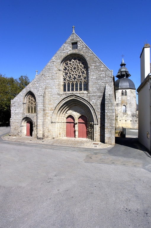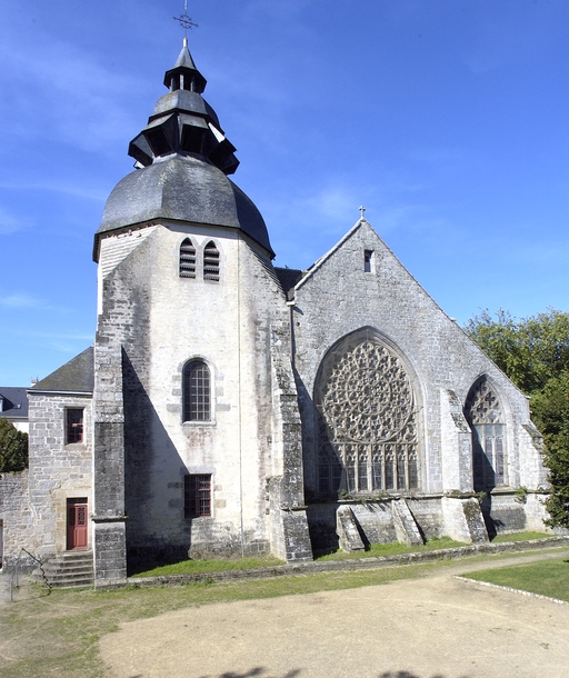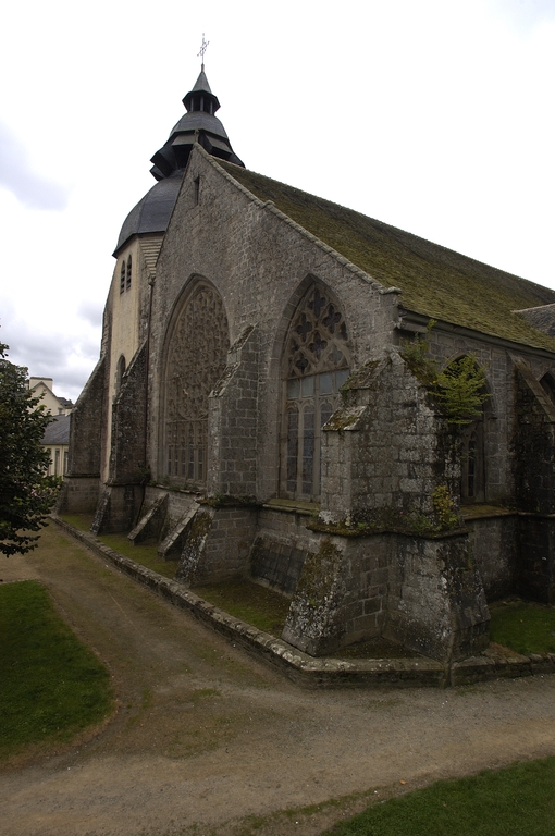 La façade occidentale annonce, par sa dissymétrie, la structure intérieure. Le mur-pignon de la nef, encadré par deux contreforts, est percé d´un portail en arc brisé dont la voussure comporte quatre ressauts retombant sur des colonnettes. Il est subdivisé en deux portes géminées surmontées d´un tympan aveugle. Au-dessus, inscrite dans un arc en plein-cintre, une belle rose rayonnante surmonte six lancettes trilobées. Le dessin de son remplage est assez proche de la maîtresse-vitre des Jacobins de Morlaix (vers 1430). La partie gauche, correspondant au bas-côté, est percée d´un portail secondaire en tiers-point, à trois voussures ; au-dessus, et désaxée vers la droite, une baie en arc brisé se compose de trois lancettes trilobées surmontées d´une rose, elle-même subdivisée en six quadrilobes périphériques et un polylobe central. Sur le flanc nord, on trouve au niveau de la deuxième travée un petit porche bâti tardivement avec les matériaux provenant de la chapelle Saint-Laurent, puis muré et transformé en chapelle dans les années 1920. Plus à l´est, la chapelle anciennement dédiée à Sainte-Barbe forme une sorte de faux transept. Son mur-pignon cantonné de contreforts angulaires est percé d´une baie que le jour de réseau à trois fleurs de lys invite à dater du début du 16e siècle. Le mur-pignon oriental est renforcé par de puissants contreforts talutés conçus pour résister aux assauts de la rivière toute proche lors des grandes marées. La baie qui l´éclaire et que l´héraldique permet de dater des années 1420-1426 présente un remplage au répertoire encore rayonnant, à l´exception des motifs garnissant les écoinçons inférieurs, des petites roses garnies de trois mouchettes tournoyantes. Sa composition, inscrite dans un arc brisé à la différence de la rose occidentale, est à rapprocher de la rose du bras sud du transept de la cathédrale de Saint-Pol-de-Léon, postérieure d´une quinzaine d´années. La rose proprement dite repose par l´intermédiaire d´une traverse sur un registre de huit lancettes tréflées surmontées de trilobes. Le mur est du clocher bâti en 1603 est aligné sur celui du chevet. Le rez-de-chaussée en est occupé par la sacristie. Carrée à la base, la tour passe au plan octogonal par l´intermédiaire de triangles de maçonnerie. Son couronnement, refait en 1896 et encore modifié en 1964, est constitué par deux dômes superposés surmontés d´un lanternon.