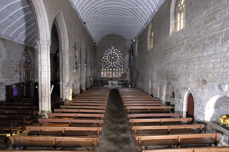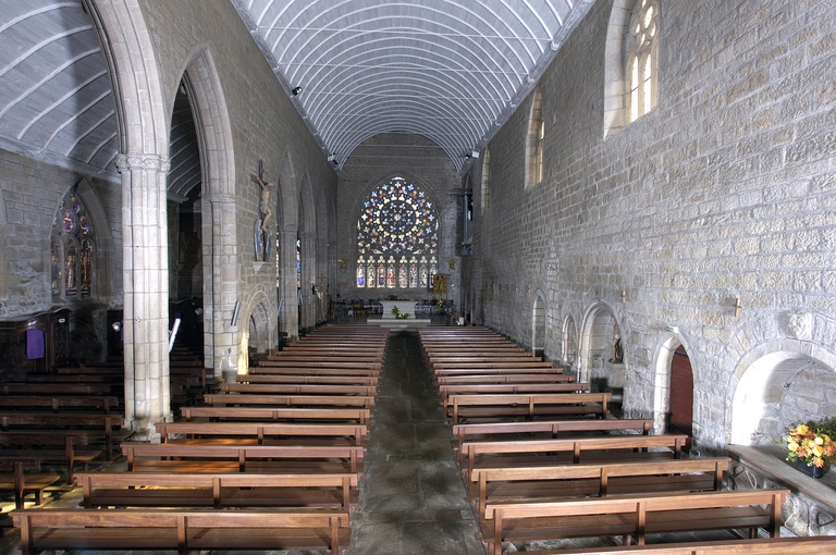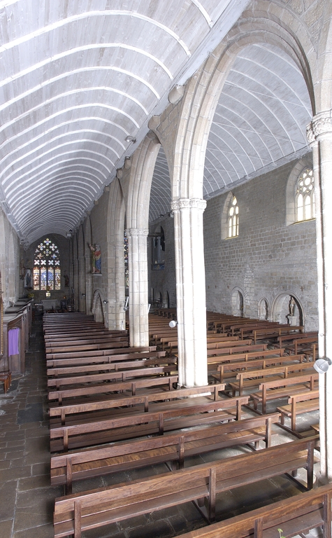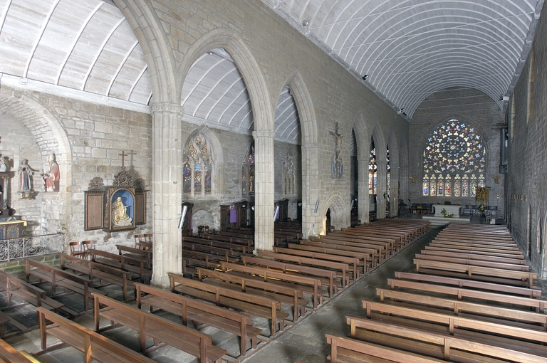 Les Carmes de Pont-l´Abbé adoptent d´emblée le parti d´une église de plan rectangulaire à deux vaisseaux de largeur inégale qui, dans la plupart des couvents de Mendiants de la région, comme les Cordeliers de Quimper, résultait de l´agrandissement au 14e siècle d´un édifice primitif à vaisseau unique. L´édifice est divisé en deux vaisseaux de huit travées par une file de supports, constitués d´un faisceau de huit colonnettes à bases prismatiques entourant un noyau circulaire. La largeur des arcades n´est pas constante. Au-dessus des chapiteaux à corbeille végétale légèrement renflée formant une frise continue et à tailloir polygonal, les grandes arcades présentent trois ressauts en tiers-point simplement chanfreinés. Ce type de supports légers et élégants témoigne de l´attrait, persistant en ce début du 15e siècle, exercé par l´esthétique de l´atelier de Pont-Croix. Au milieu de l´église, les quatrième et cinquième travées sont séparées par un pan de maçonnerie pleine, évidée dans sa partie basse par un enfeu qui aurait abrité, selon une tradition non confirmée, le tombeau du fondateur. Le vaisseau principal, éclairé au sud par quatre fenêtres hautes, est couvert d´un lambris en berceau plein-cintre, le bas-côté, d´un berceau rampant. La charpente en chêne, à entraits retroussés, a fait l´objet d´analyses dendrochronologiques, dont les échantillons les plus intéressants fournissent une datation comprise entre 1473 et 1554. Un jubé divisait en deux parties l´édifice, comme en témoignent la porte d´accès à l´escalier et la piscine, vestige d´un ancien autel adossé.
