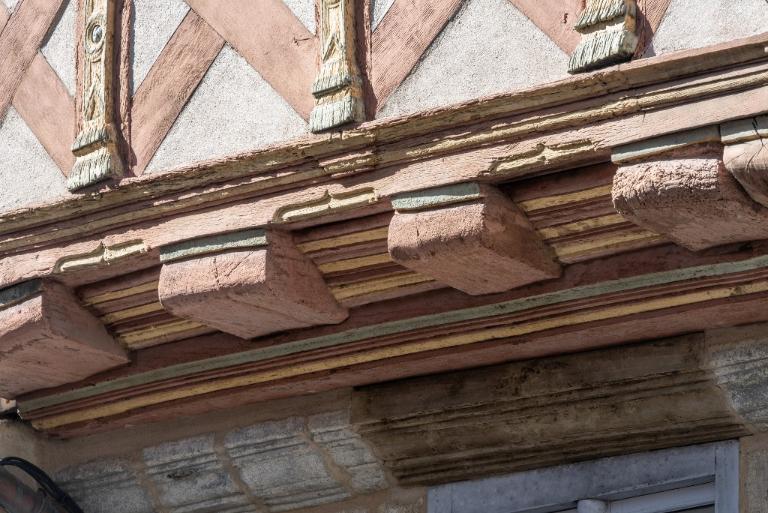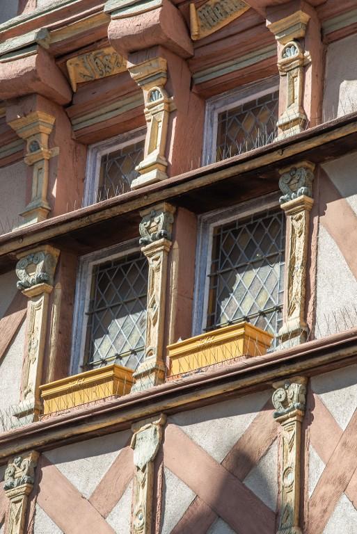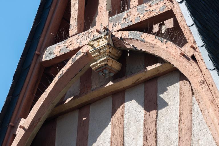 Le second est mitoyen rue Saint-François. Il présente un rez-de-chaussée remanié, un premier étage soigneusement maçonné en pierres de taille avec une ouverture centrale puis une corniche soutenant un imposant débord du second étage en pan de bois. Les abouts de solives visibles sont très larges et séparés d'entretoises moulurées. La sablière de chambrée s'orne d'accolades soulignant l'espace entre chaque solive et de moulures formant la base du remarquable décor Renaissance qui se développe sur les poteaux. Ceux-ci sont sculptés de pilastres décorés de divers motifs dont un blason. Au-dessus, on distingue les initiales IHS (Iesus Hominum Salvatore) sur un décor de parchemin ainsi qu'un autre mot. Une lisse basse et une lisse haute soulignent l'espace attribué aux ouvertures. Chaque poteau reçoit une large solive des combles qui présentent une ferme débordante à aisseliers courbes et poinçon orné.