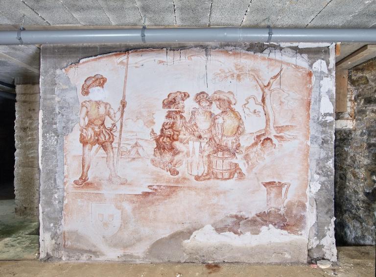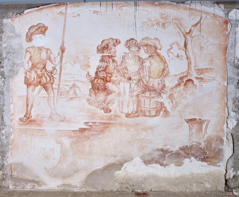 La grande peinture murale est peinte en ocre rouge et en brun dans le style sanguine. Elle figure au deuxième plan, à hauteur du regard, trois lansquenets (soldats mercenaires, en allemand Landsknechte) assis jouant aux dés sur un tambour et un quatrième lansquenet, debout, lance à la main et épée au ceinturon montant la garde. Cheveux longs, barbu pour au moins l’un d’entre eux, ils arborent des vêtements de la Renaissance : souliers, chausse courte bouffante à mi-cuisse, pourpoint, toque et épée au ceinturon. A droite de la composition se trouve représenté un arbre feuillu.