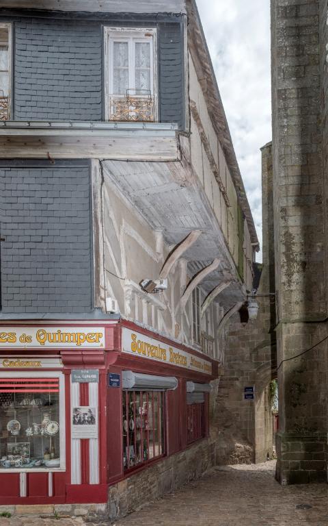 Ces maisons sont mixtes : pierre et pan de bois, lequel est réservé à la mise en œuvre d'une ou de plusieurs façades. Les murs abritent quant à eux les conduits de cheminée et les escaliers. Le rez-de-chaussée est maçonné soit dans son intégralité (ex. 7 rue Dom Morice), soit à minima par un mur-bahut (ex. 15 Place Saint-Michel). Les murs mitoyens peuvent être à l'aplomb (rue Brémond d'Ars), ou accompagner l'encorbellement de la façade comme au 9 rue Savary. Une maison aujourd'hui disparue présente une disposition originale avec un pignon principal rue de l'Isole et une importante lucarne en forme de pignon du côté de la place Carnot pour accompagner au mieux sa position d'angle (photo Cl. Furne et Tournier, 1857? Musée départemental breton, Quimper). La technique de l'encorbellement sur solives avec entretoises prédomine. Il existe néanmoins un exemple de porte-à-faux très important soutenu par des aisseliers au second étage du 2 rue Gauguin. Sur une carte postale figurant la rue Mellac, on peut observer par ailleurs un surplomb sur solives très important sans aisseliers visibles, formant auvent au-dessus d'un mur-bahut servant d'étals. Le contreventement des structures est simple : poteaux, écharpes, potelets et croix de Saint-André. Seuls deux bâtiments conservent des pièces disposées en chevrons (7 rue Dom Morice et 2 rue Gauguin).