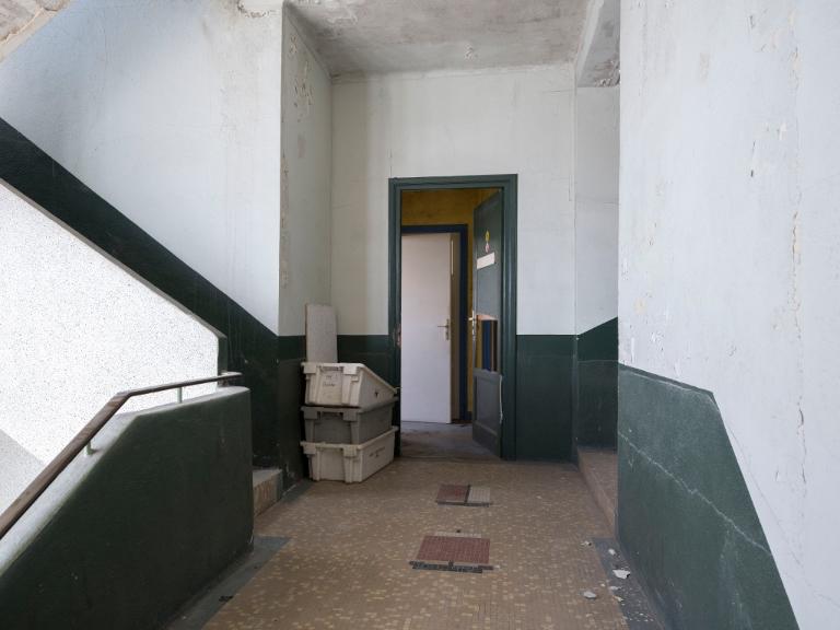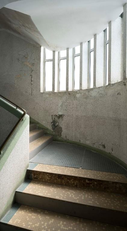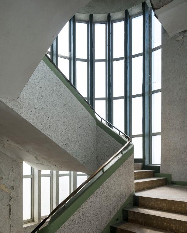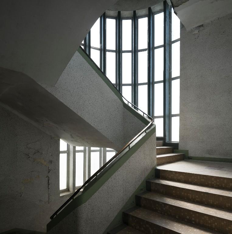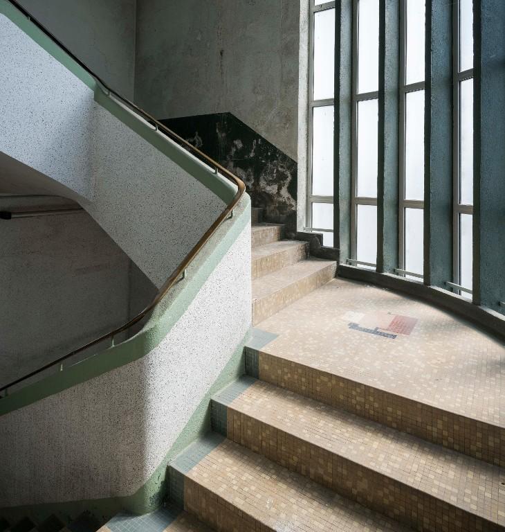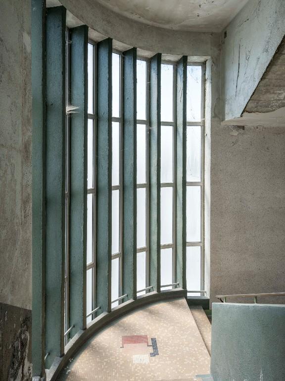 Bâtiment en béton ; orienté face au bassin de l'arrière-port, longé au nord par les anciennes voies ferrées ; 3 niveaux ; section circulaire sur les 3 niveaux accueillant l'escalier de distribution en béton ; verrières ; mosaïque de carreaux ciment coloré représentant des navires au sol des couloirs et paliers.