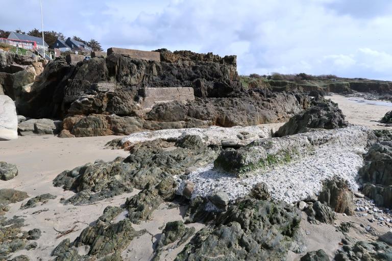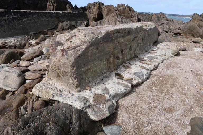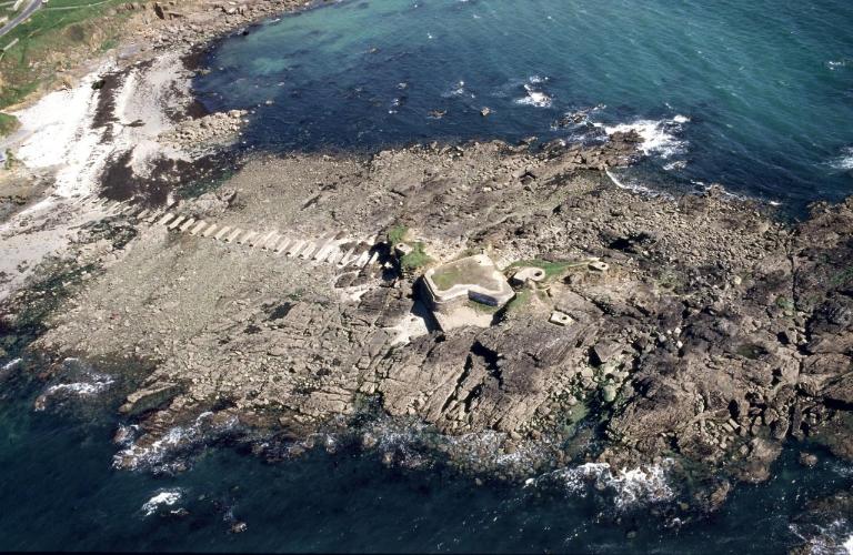 Cet ensemble fortifié permet aussi d’observer les dégradations liées à l’érosion marine : les substrats de l’îlot ont été emportés par la mer ne laissant que les rochers - presque à vif - et les bunkers. L’angle nord-est du bunker-abri se retrouve en suspension dans le vide.