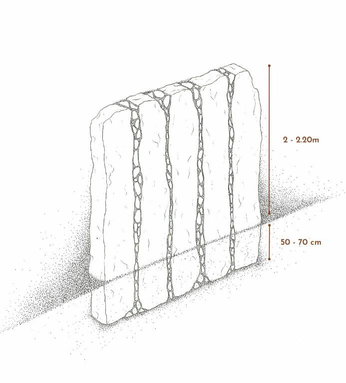 La technique constructive repose sur l’implantation directe des orthostates dans une tranchée préalablement préparée. Enfouies à une profondeur variant de 50 à 70 cm, ces pierres assurent à la fois les fonctions de fondation et de paroi porteuse. Chaque orthostate présente une largeur comprise entre 30 et 50 cm, une épaisseur de 20 à 25 cm et une hauteur allant de 2 m à 2,20 m.
