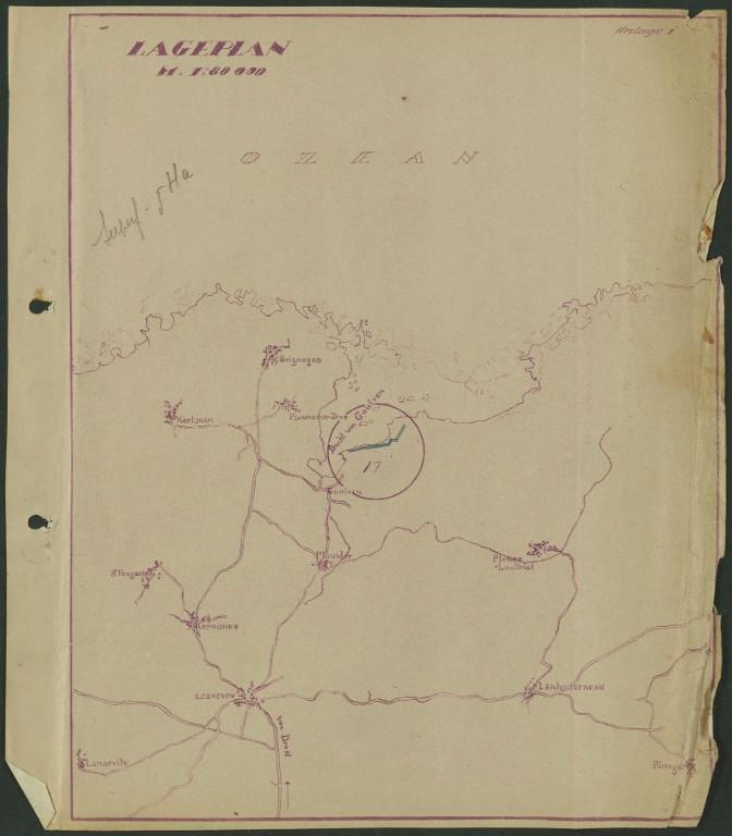 A 501 (?) : Brétouaré à Plounévez-Lochrist. La vue aérienne verticale (1950-1965) permet d’observer une grande construction rectangulaire (approximativement 45 m x 16 m) ainsi que d’autres constructions plus petites. Il pourrait s’agir d’une station radar.
