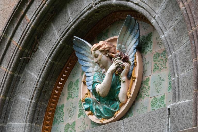 Le tympan de la porte de l’élévation nord-ouest est orné d'un haut-relief en terre cuite vernissée polychrome figurant, dans un médaillon circulaire entouré d’ornements végétaux dorés, un ange au visage féminin doux et idéalisé, aux ailes déployées, tenant dans ses mains un bouquet de fleurs. En arrière-plan, le mur est couvert de carreaux décoratifs ornés de motifs végétaux stylisés rappelant l’Art nouveau (vers 1890–1905).