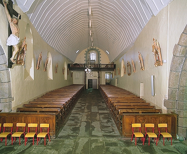Plan en croix latine, lambris de couvrement, clocher-porte, sacristie accolée au chevet, chevet plat, toit à longs pans, noue, croupe, pignon découvert, toit en carène, appentis.