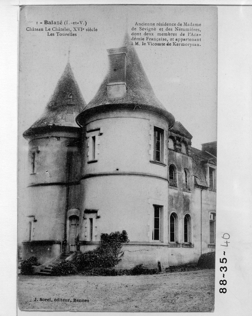 KERMOYSAN, Hervé de. Le château du Châtelet en Balazé, Société archéologique d'Ille-et-Vilaine, bulletin et mémoires, Bannalec, Imprimerie Régionale, 1997.