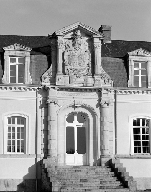 Sujet : armoiries d'alliance des familles Hay-Le Neptun et La Carre de Saumery, support : fronton de la porte d'entrée.