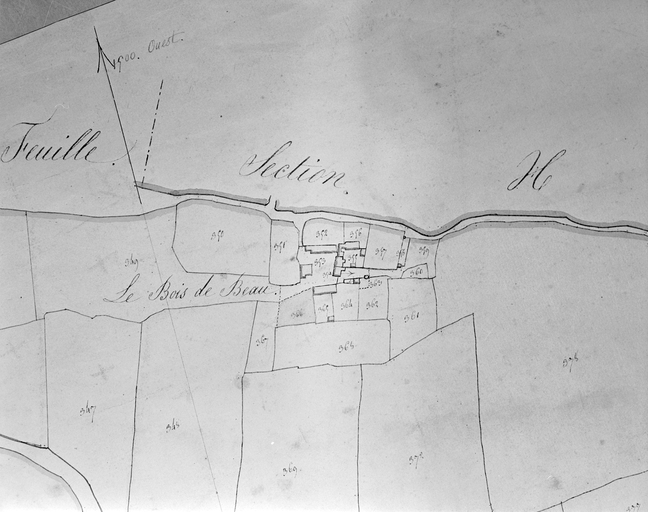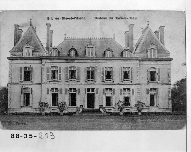 Château construit à l'ouest de l'emplacement d'un manoir plus ancien figurant sur le cadastre de 1824. Le corps central du château a été construit en 1842 ainsi que les communs au nord et l'orangerie à l'ouest, pour la famille de La Plesse, de Vitré. En 1872, construction d'une serre chauffée et d'un atelier d'artiste, pour Alexandre de La Plesse. En 1875, ajout de deux pavillons aux extrémités du logis et construction d'une écurie à l'est et d'une conciergerie en forme de chalet au sud, travaux peut-être attribuables à Jacques Mellet. La chapelle, de style néo-roman, est construite entre 1890 et 1900, peut-être par Henri Mellet, architecte à Rennes. Le Bois-Beau est conçu comme une maison des champs, le corps central étant accosté de 2 aile basses formant terrasse, entre deux ailes de communs de style néo-toscan. Ajout d'un étage et de toits en pavillon à la française sur les ailes latérales en 1880, d'une conciergerie en forme de chalet (2 logements), puis d'une chapelle en 1890, en font un véritable petit château. Appartient aujourd'hui à Mme de Coquereaumont.