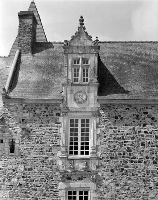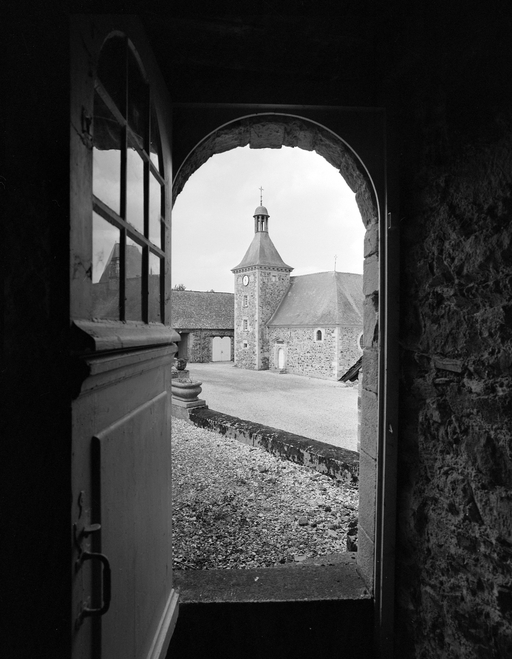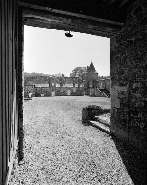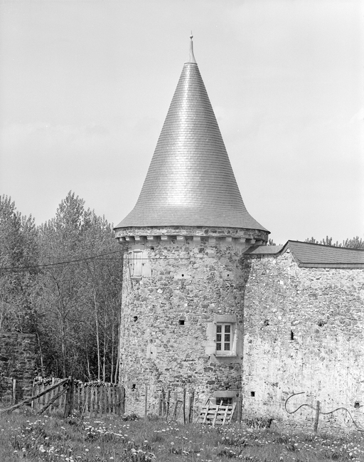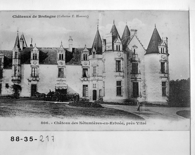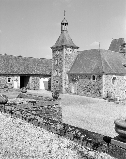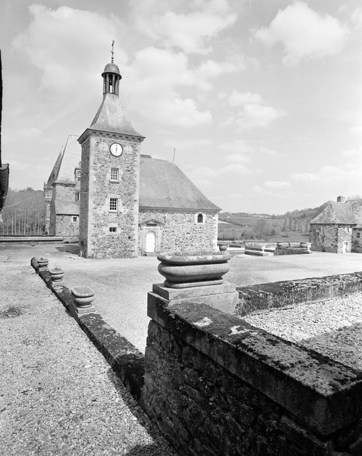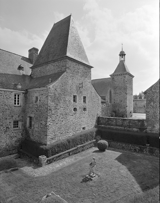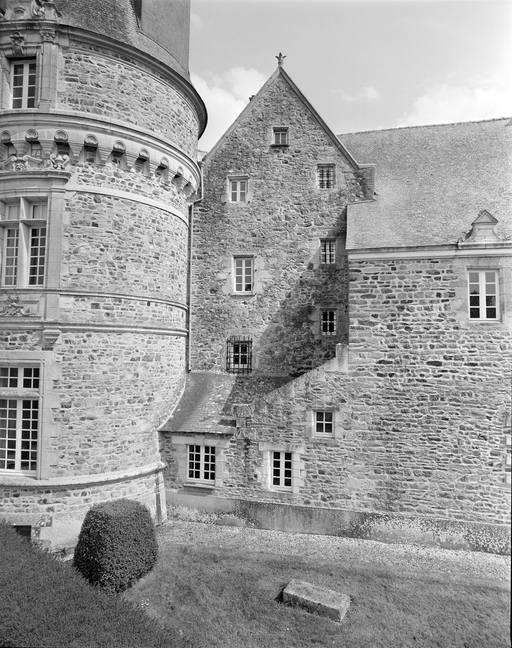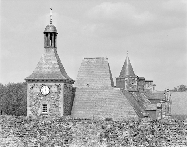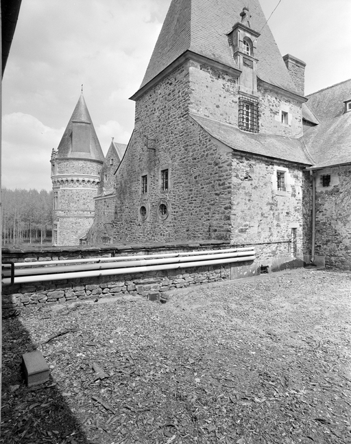 Typologieschâteau de plan en équerre, à chapelle d'attache, hagioscope, élément de défense, bouche à feu ; rhabillage. Néo-Renaissance