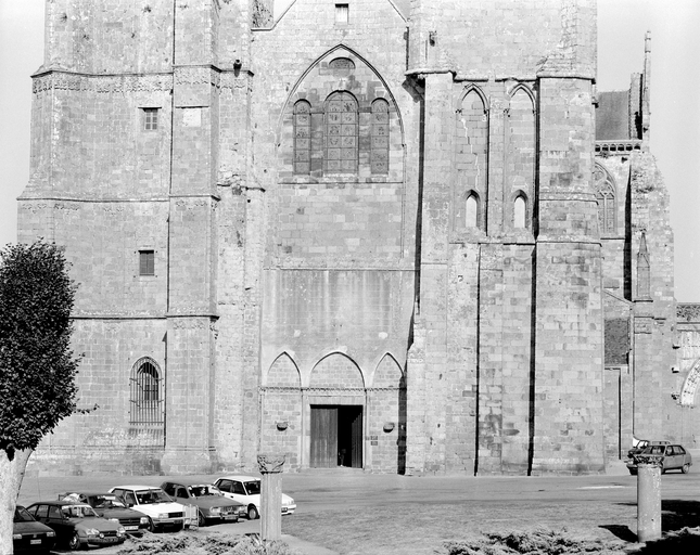 De l' édifice roman subsistent : la base de la tour nord dans le collatéral nord qui peut dater du 11e siècle (?), le mur sud de la même tour du 12e siècle ainsi que le parement intérieur de la tour sud et quelques éléments d' appareillage à la base de la façade occidentale. Du 13e siècle datent : la nef terminée en 1223 avec ses collatéraux et le petit porche sud. Le transept, le choeur avec ses chapelles latérales furent construits au cours de la 2ème moitié du 13e siècle. Au début du 14e siècle, construction du grand porche accolé au bras sud et de part et d' autre de ce dernier, à l' ouest, la salle capitulaire, à l' est le trésor. Lors de la même campagne, édification de la chapelle d' axe du chevet. Au cours du 14e siècle, fermeture latérale du grand porche sud. Au 15e siècle, remaniements de détails dans le décor au petit porche sous l' évêque Etienne Coeuret (1405, 1429) et probablement aussi dans celui du grand porche dont la voûte porte ses armoiries. Au début du 16e siècle, reconstruction de la tour nord sous l' évêque Mathurin de Plédran (1504, 1521) . Au 17e siècle reprise de la base de la tour sud, construction d' un campanile en 1660 par l' architecte Pierre Corbineau et d' une sacristie, au sud est. Au 18e siècle, remaniements à l' élévation occidentale : fermeture de la grande baie par un triplet surmonté d' un occulus lors de l' installation du grand orgue et démolition probable du porche ouest. En 1845, pose d' une balustrade au-dessus du grand porche. De 1866 à 1888, restaurations et créations importantes de vitraux par les ateliers Ely de Nantes (1872, 1878), Didron de Paris (1880) et Kuchelbecker et Jacquier du Mans (1884, 1887).