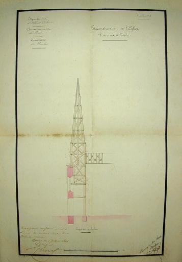 Plan de reconstruction de l'église. Feuille n°5, élévation sud de la charpente du clocher, levée par l'architecte Nugue. Mairie des Brûlais, 1844.