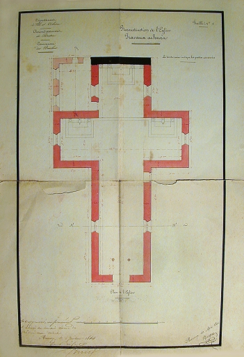 Plan de reconstruction de l'église. Feuille n°1, plan au sol, levé par l'architecte Nugue. Mairie des Brûlais, 1844.