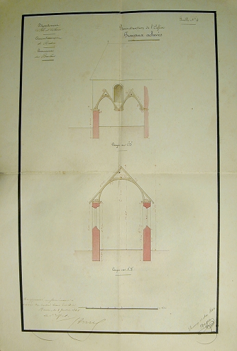 Plan de reconstruction de l'église. Feuille n°4, coupes longitudinale de la sacristie et du choeur, levées par l'architecte Nugue. Mairie des Brûlais, 1844.