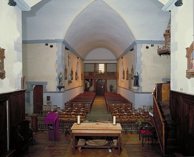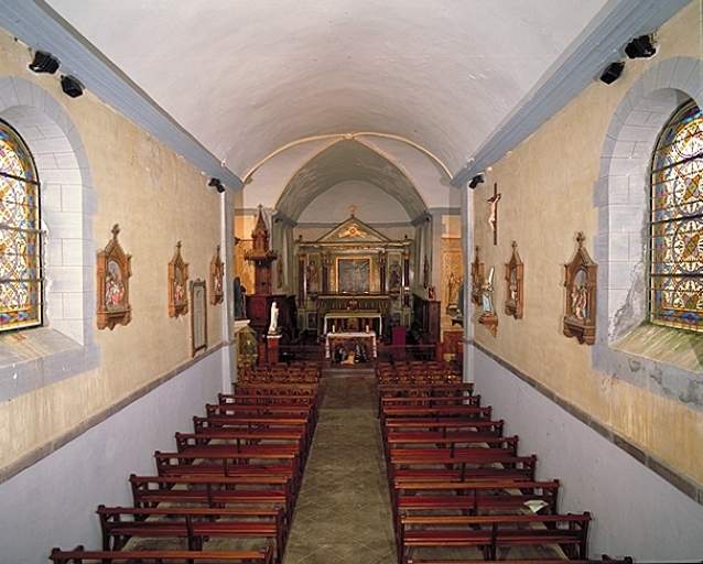 Plan en croix latine ; 1 vaisseau ; Chevet plat ; Clocher en façade ; Toit à croupes ; Crouvrement de fausses voûtes.