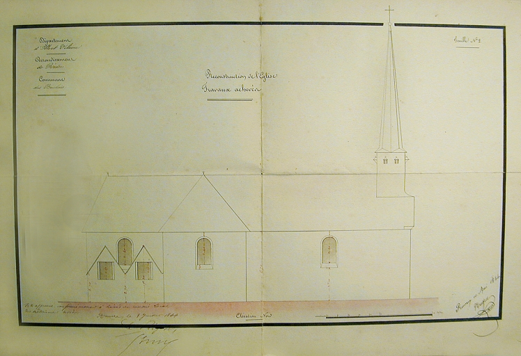 Plan de reconstruction de l'église. Feuille n°2, plan en élévation de la côtière nord, levé par l'architecte Nugue. Mairie des Brûlais, 1844.