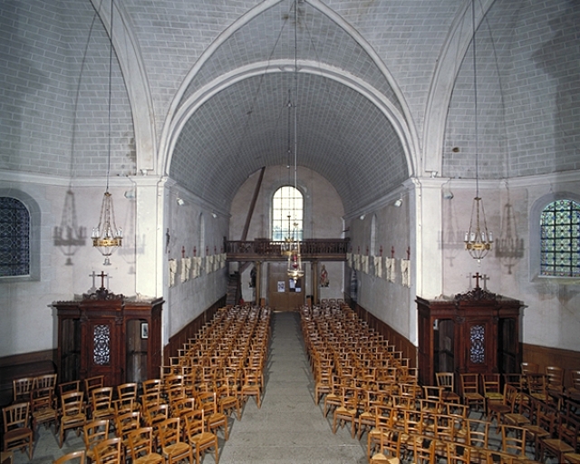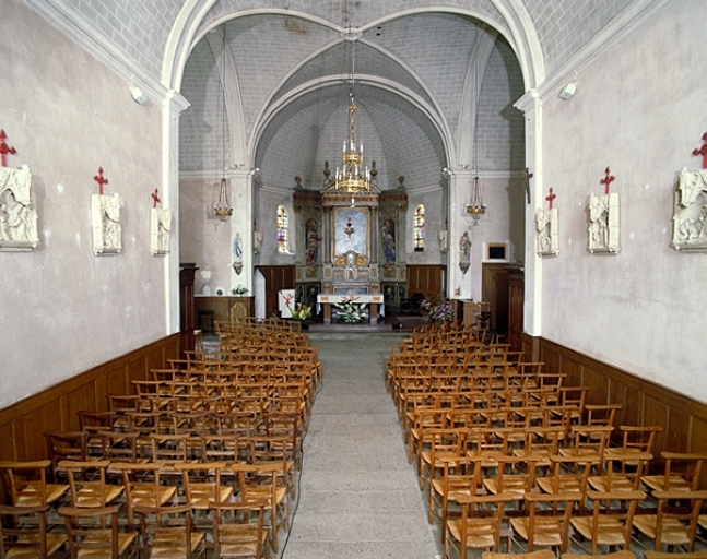 Plan en croix latine ; chevet et transept à pans coupés ; clocher à la croisée du transept ; voûtes en berceau et voûtes d'ogives.