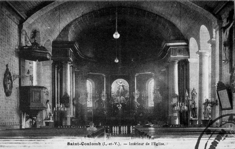 Saint-Coulomb (I.-et-V.) Intérieur de l'église. Carte postale, [s.l. ; s.n. ; s.d.].