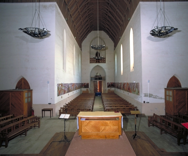 Plan en croix latine, lambris de couvrement, clocher-porche, chevet à pans coupés.
