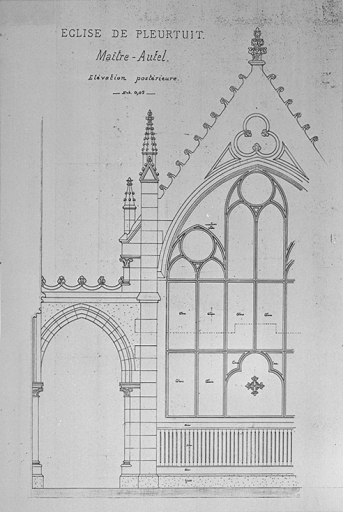 Maître autel, élévation postérieure. Dessin signé A. Regnault, 8 décembre 1898, encre de chine et lavis rose sur papier toilé, échelle 5/100e. (A.D. Ille-et-Vilaine, série 0 (1037/...).