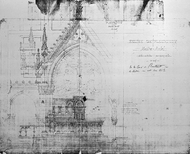 Maître autel, élévation latérale. Dessin signé A. Regnault, 8 décembre 1898, crayon papier sur calque. (A.D. Ille-et-Vilaine, série 0 (1037/...).