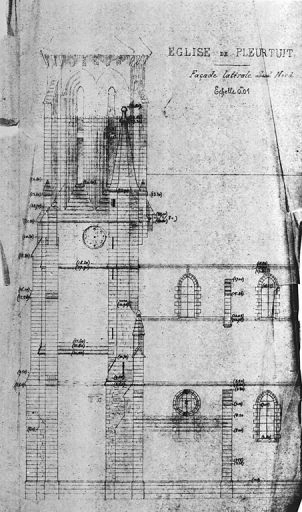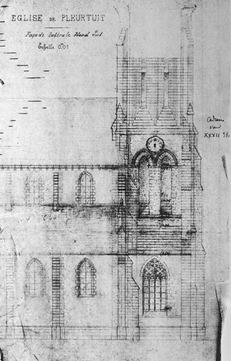Eglise de Pleurtuit, façade latérale Sud. Crayon papier sur calque, attribué à A. Regnault, échelle 1/100e [s. d.]. (A.D. Ille-et-Vilaine, série 0 (1037/...).