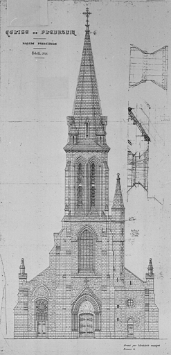 Eglise de Pleurtuit, façade principale. Dessin attribué à A. Regnault, [s. d.], encre de chine sur papier, échelle 1/100e. (A.D. Ille-et-Vilaine, série 0 (1037/...).