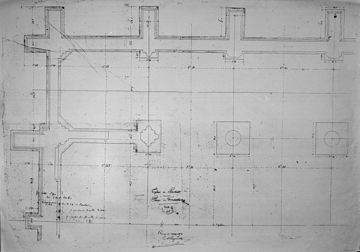 Plan des fondations : partie sud du choeur et collatéral. Dessin signé par A. Regnault, 12 août 1873, encre de chine et lavis rouge. (A.D. Ille-et-Vilaine, série 0 (1037/...).
