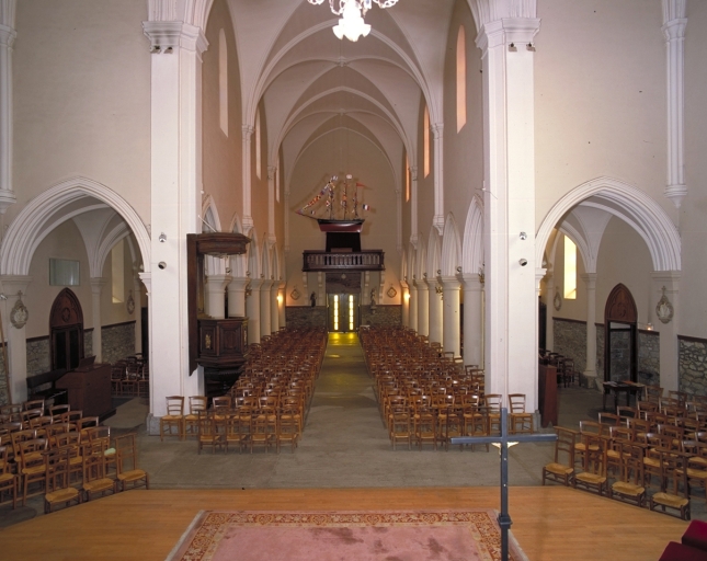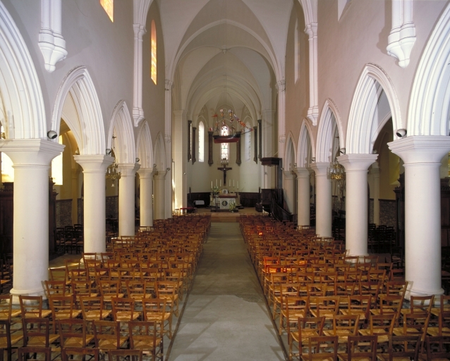 Eglise à 3 vaisseaux, plan en croix latine, voûte d'ogives, clocher-porche, chevet à pans coupés.