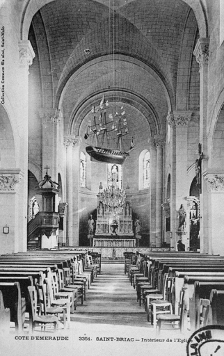 La nouvelle église est construite à partir de 1867, par les architectes malouins Frangeul. Ce n'est que 20 ans après, en 1887, que le maître-autel offert par les paroissiens est installé. Deux ateliers de verriers s'occupent l'un des baies de la nef (Vie de saint Briac et verrières hautes décoratives), l'autre de celles du choeur et des bras du transept (représentation de saints et du Sacré Coeur). En 1928, on fait appel au Lavallois Alleaume pour les baies des chapelles latérales (Sainte Famille et Présentation au temple). Enfin, dans les années 1950-60, les verrières du bras sud du transept sont remplacées (saint Jean et saint Louis).